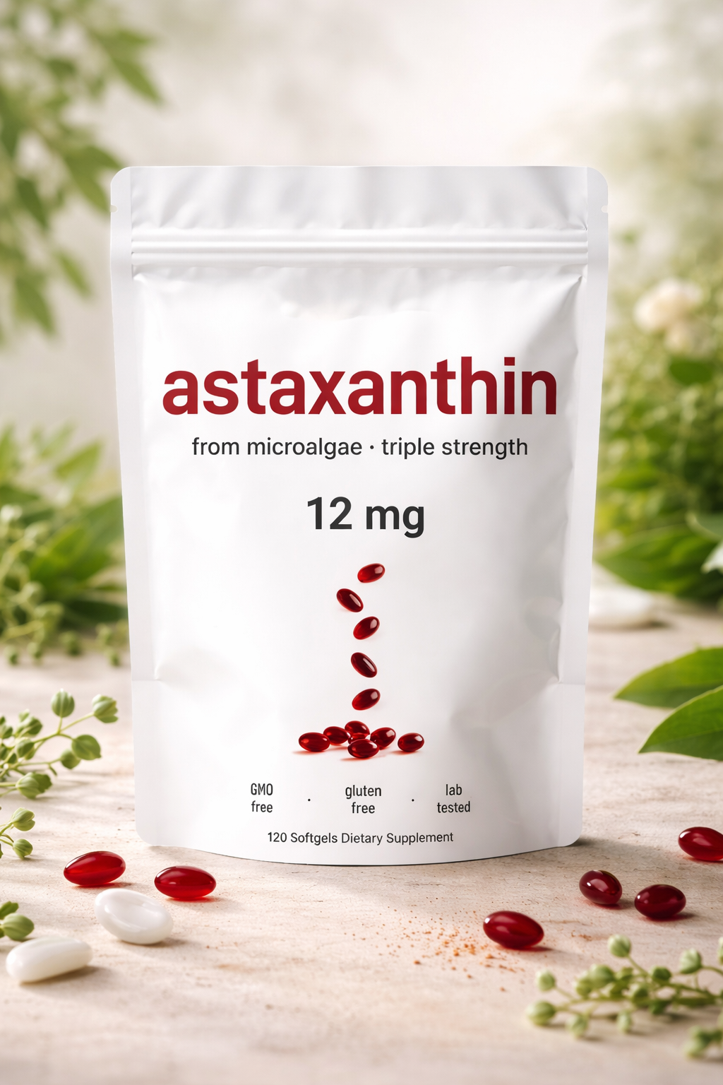 • Astaxanthin (12 mg) — derived from Haematococcus pluvialis microalgae